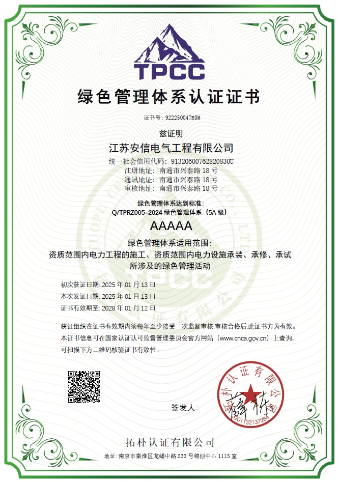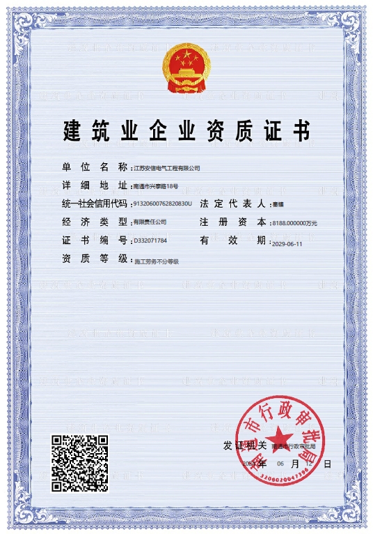 在創(chuàng)業(yè)之初,公司就堅持高起點的戰(zhàn)略思路,廣納賢才,集聚行業(yè)精英,創(chuàng)新發(fā)展,做優(yōu)企業(yè)品牌。現已取得:承裝二級、承修二級、承試二級,電力工程施工總承包二級,輸變電工程專業(yè)承包二級,建筑工程施工總承包二級,建筑機電安裝專業(yè)承包二級,地基基礎專業(yè)承包二級資質證書,并通過了質量、環(huán)境、職業(yè)健康和安全管理體系認證,確保各項工作有序管控。